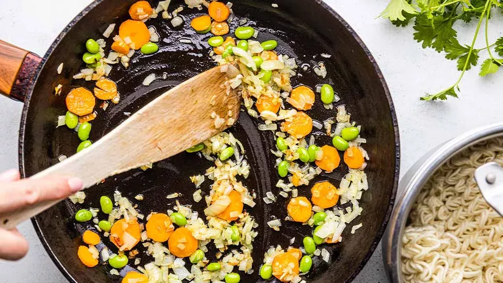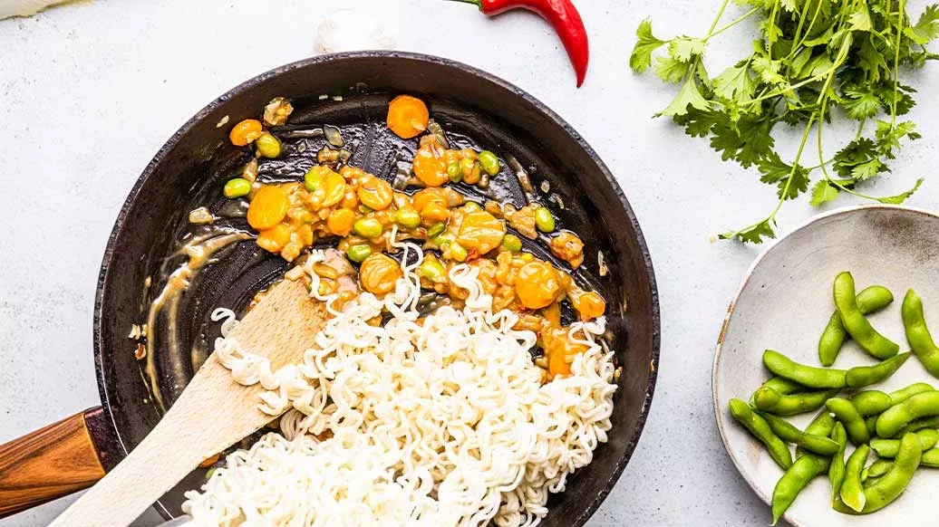 150 g di ramen istantaneo – 100 g di pak choi – 1 cipolla – ½ carota – 30 g di edamame pelati – 1 spicchio d'aglio – 1 cucchiaino Olio di Sesamo Tostato Kikkoman – 1 cucchiaio di burro di arachidi