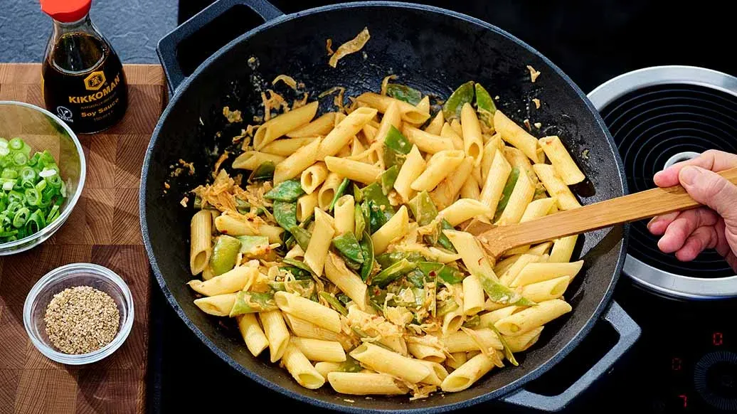 300 g di penne o pennette – ½ cucchiaino di pasta di gochujang – 2 cucchiai di burro di arachidi – 1 cucchiaino di sciroppo d’acero – 4 cucchiai Salsa di Soia a Fermentazione Naturale Kikkoman