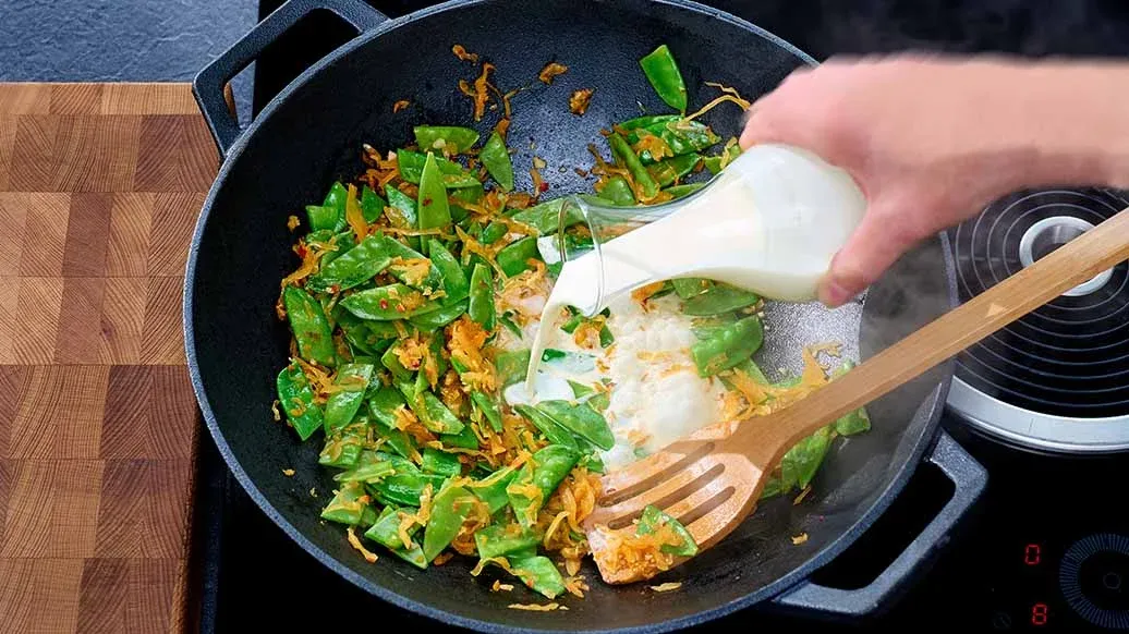 Trita finemente l’aglio e fallo soffriggere nell’Olio di Sesamo Tostato Kikkoman in un wok o in una padella capiente. Aggiungi il kimchi e le taccole (tagliali a metà se necessario) e cuoci brevemente. Versa la panna, porta a ebollizione e lascia sobbollire per circa 5 minuti.