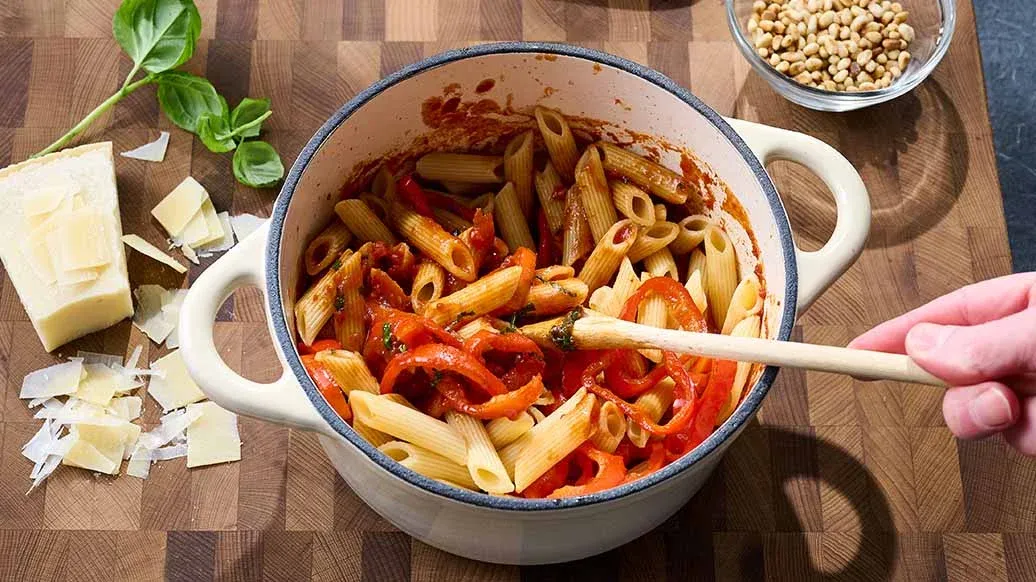Un incontro tra la tradizione italiana e i sapori decisi dell'Asia: penne al dente condite con salsa al pomodoro arricchita da salsa di Soia Kikkoman e Salsa Kimchi Piccante Kikkoman. Il tutto guarnito con Parmigiano e pinoli tostati.