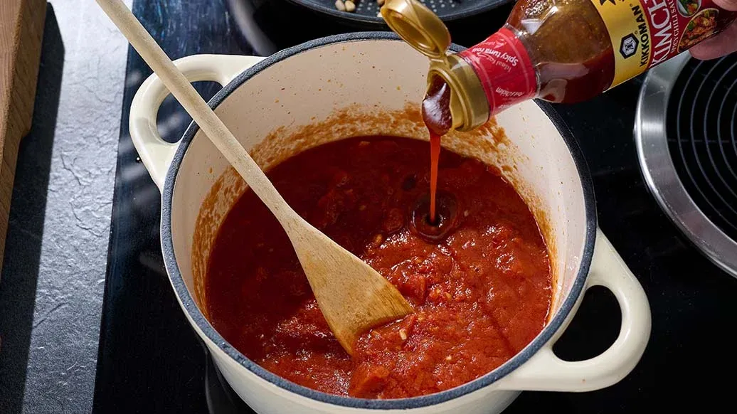 2 spicchi d'aglio – 3 cucchiai di passata di pomodoro – 1 cucchiaio di olio d'oliva – 2 cucchiaini Salsa Piccante al Peperoncino Kimchi Kikkoman – 600 g di polpa di pomodoro (in scatola) – 1 cucchiaino di zucchero di canna (o Condimento Dolce in Stile Mirin Kikkoman) – 40 g di pinoli