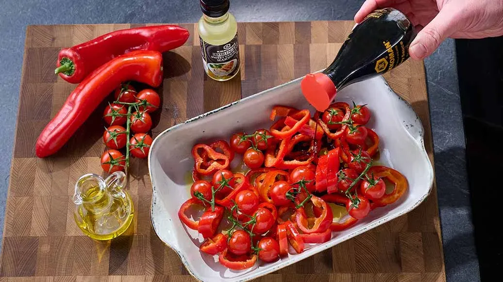 Preriscaldare il forno a 200°C. Tagliare il peperone rosso ad anelli. Mescolare con i pomodorini, l'olio, lo zucchero e la Salsa di Soia Kikkoman. Distribuire in una piccola pirofila e arrostire nel forno preriscaldato per 10-15 minuti fino a quando i pomodorini non inizieranno a scoppiare.