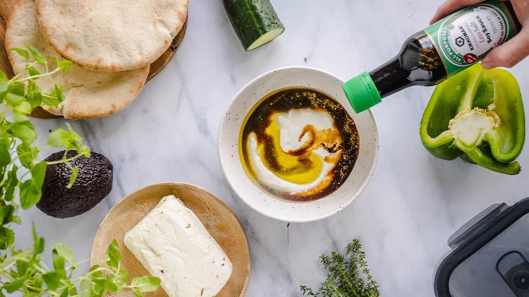 2 cucchiai di yogurt greco – 2 cucchiai Salsa di Soia a Fermentazione Naturale a Tasso Ridotto di Sale – 2 cucchiai di succo di limone – 1 cucchiaio di olio d'oliva – 2 pita
