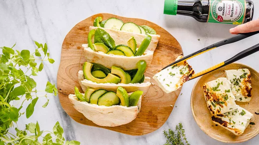 È ora di provare una nuova versione della classica pita: in questa ricetta, le pita alla griglia sono ripiene di halloumi succoso, verdure croccanti e una salsa rinfrescante. Ideali per un piatto veloce da gustare quando si va di fretta!