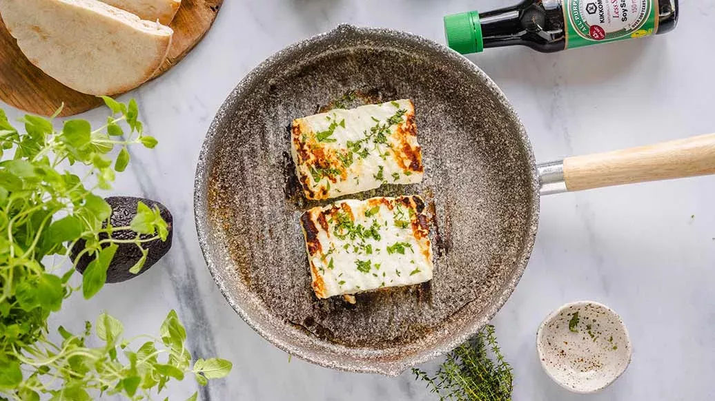 Taglia l'halloumi a metà, condiscilo con olio d'oliva ed erbe, e friggilo su entrambi i lati su una griglia.
