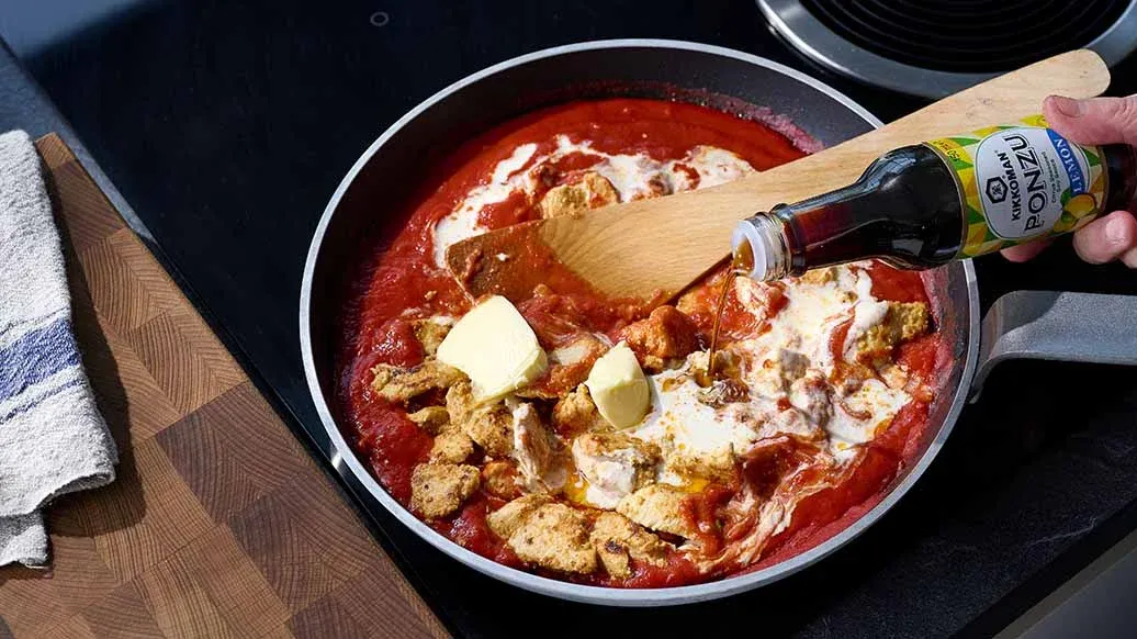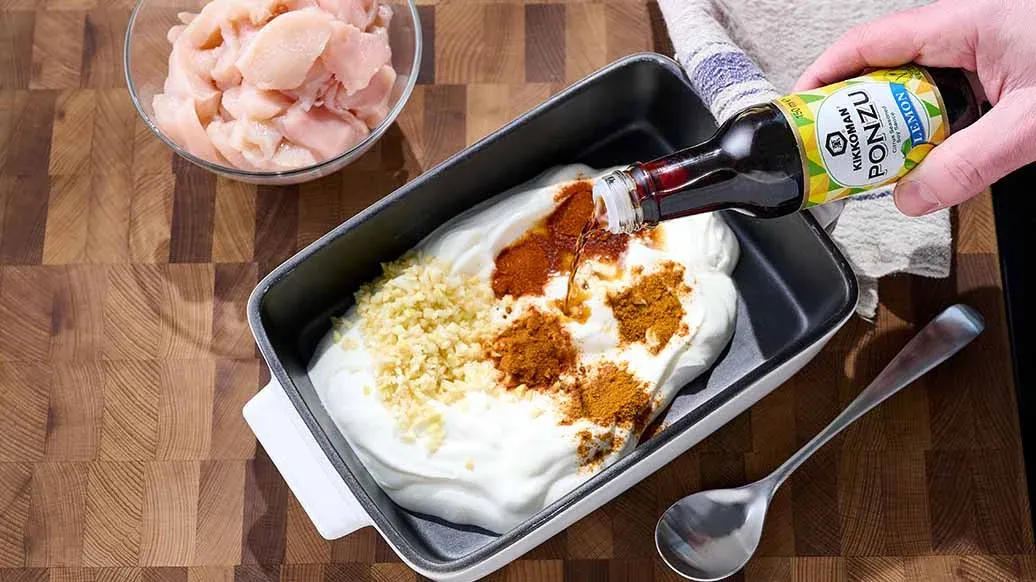 Uno dei piatti più amati della cucina indiana: tenero pollo marinato in yogurt piccante, con Ponzu al Limone Kikkoman e salsa cremosa. Un piatto ricco e confortante, con un tocco di garam masala.