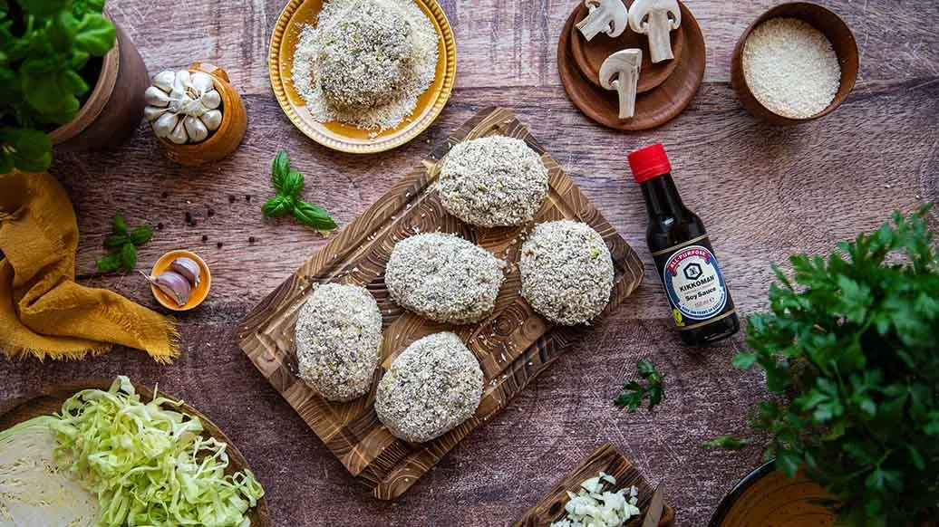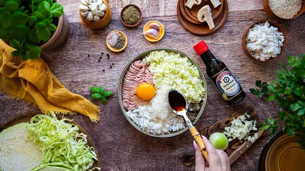 Trita l'aglio. Taglia finemente la cipolla, grattugia i funghi e soffriggili in olio caldo in una padella. Lascia raffreddare e trasferisci in una ciotola. Trita il cavolo in un robot da cucina e aggiungilo alla ciotola. Aggiungi il riso, la carne, l'uovo, il Panko Kikkoman, l'aglio, la Salsa di Soia Kikkoman e le spezie. Mescola fino a ottenere un composto omogeneo.