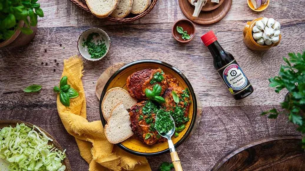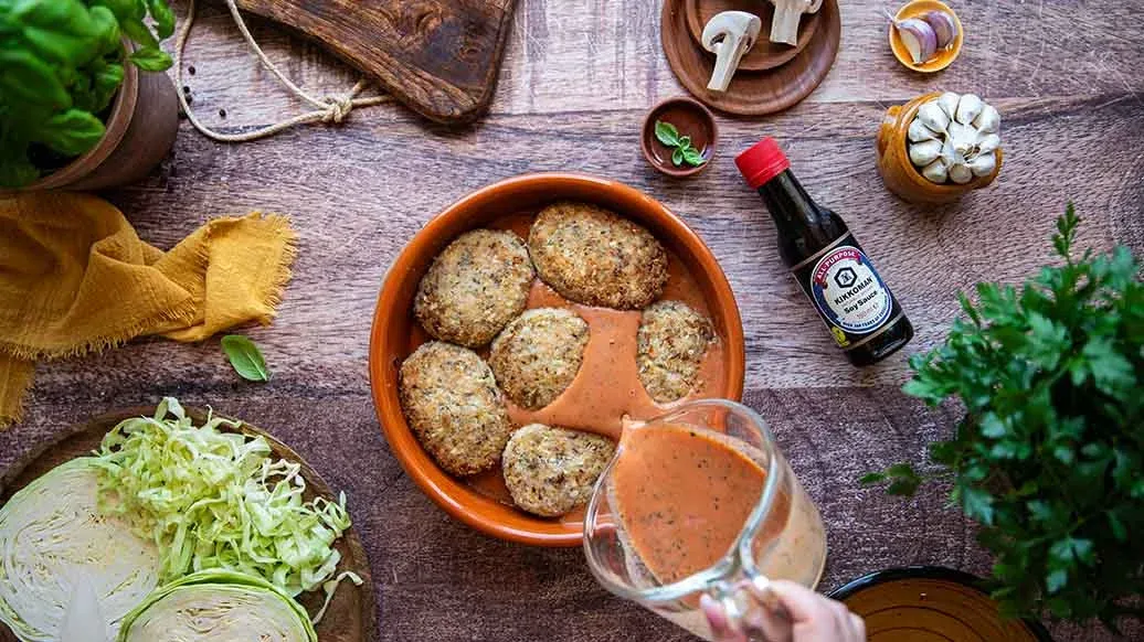 Mescola la passata di pomodoro con acqua, Salsa di Soia Kikkoman, panna, zucchero, erbe e spezie. Versa la salsa preparata sulle polpette di cavolo e metti la pirofila in un forno preriscaldato a 180 °C (calore dall'alto e dal basso). Copri e cuoci per 30 minuti, poi scopri e cuoci per altri 15 minuti.