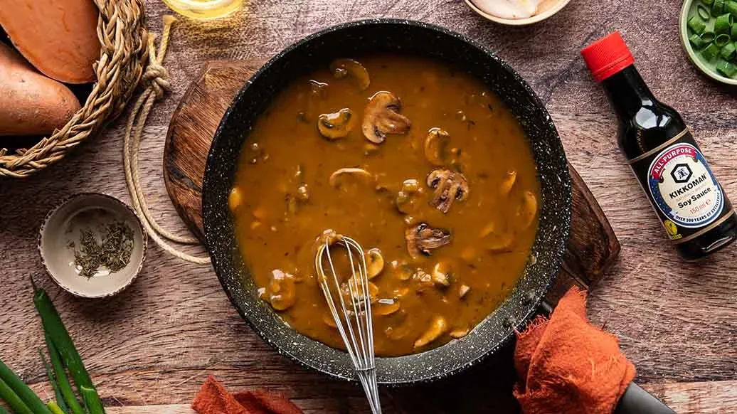 Scalda l'olio in una padella, aggiungi i funghi e un cucchiaio di Salsa di Soia Kikkoman. Fai rosolare fino a doratura, quindi trasferisci su un piatto. Aggiungi il burro, lo scalogno e l'aglio nella padella e fai rosolare fino a quando non saranno morbidi. Aggiungi la farina 00 e la fecola di patate, quindi cuoci fino a doratura. Versa il brodo, rimetti i funghi nella padella, aggiungi 2 cucchiai di Salsa di Soia Kikkoman e le spezie. Quindi fai sobbollire a fuoco lento, mescolando continuamente fino a quando la salsa non si sarà addensata.
