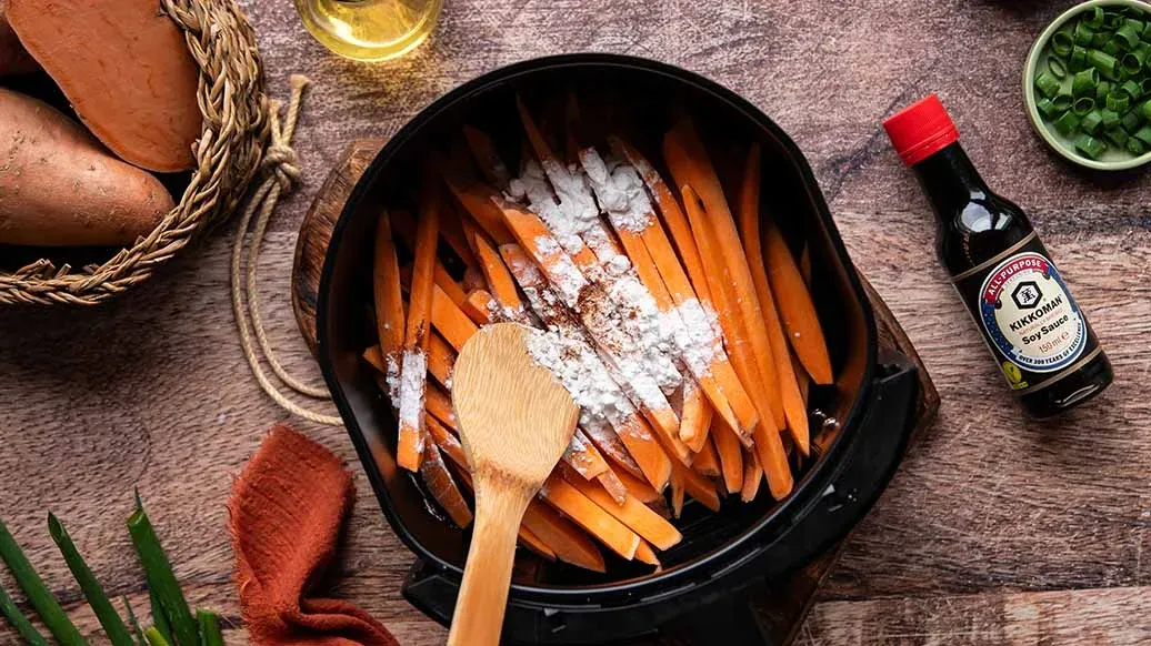 Lava le patate dolci e tagliale a bastoncini di circa 1,5 cm di spessore. Trasferiscile in una ciotola e versaci sopra dell’acqua fredda. Lascia in ammollo per 20 minuti. Asciuga bene le patatine, aggiungi l'olio, la farina di mais, la fecola di patate e le spezie. Mescola bene e trasferisci in una friggitrice ad aria già calda. Cuoci a 200 °C per 30 minuti. Mescola le patatine più volte durante la cottura.