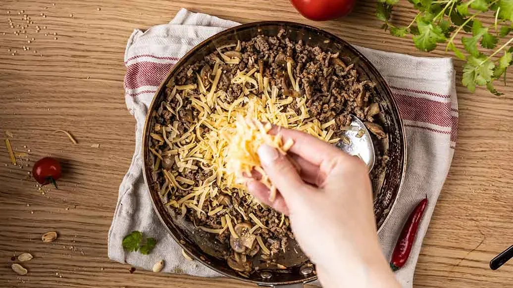 1 cucchiaio di olio vegetale – ½ cipolla, tritata – 100 g di funghi – 150 g di carne macinata di manzo – 1 cucchiaio Salsa di Soia a Fermentazione Naturale Kikkoman – 2 g di coriandolo tritato – 50 g di formaggio grattugiato (ad es. Cheddar)