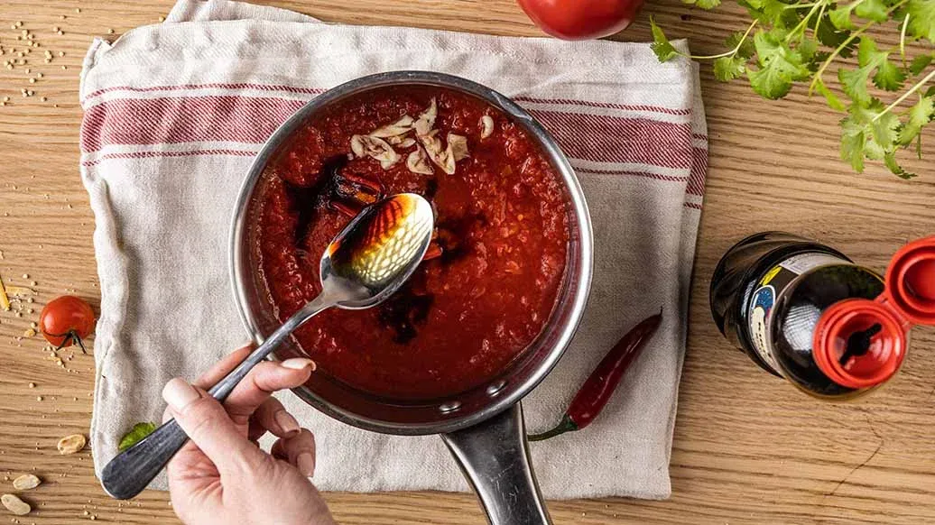 200 g di pomodori pelati in scatola – 1 spicchio d'aglio, tritato – ½ peperoncino rosso, tritato – 1 cucchiaio Salsa di Soia a Fermentazione Naturale Kikkoman – 3 cucchiai di zucchero – 3 cucchiai di aceto di riso