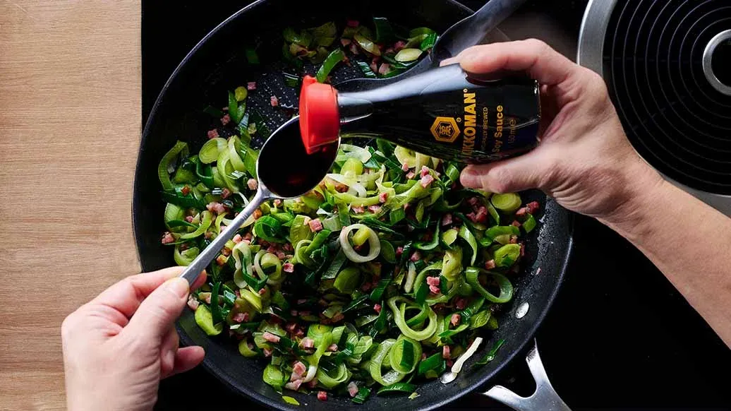 Tagliare i porri a rondelle. Friggere la pancetta a dadini in una padella antiaderente. Aggiungere i porri e farli soffriggere per circa 10 minuti. Condire con la Salsa di Soia Kikkoman.