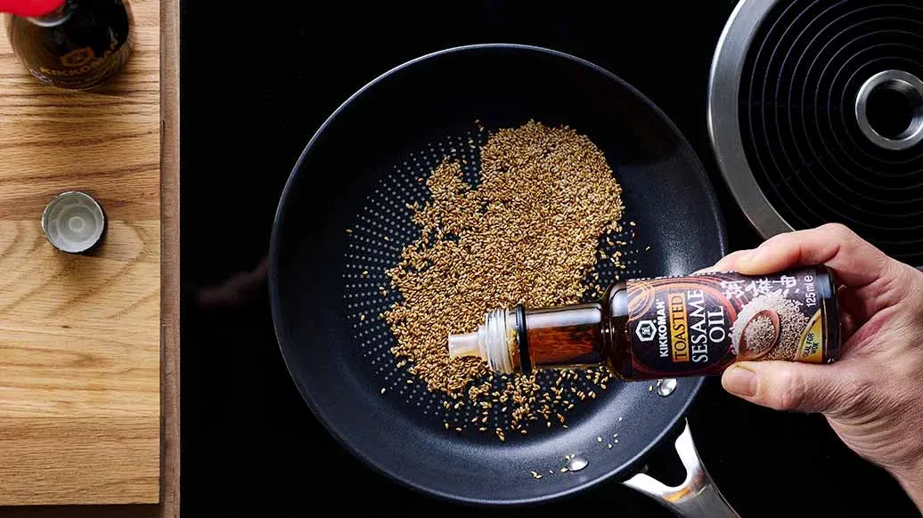 2 cucchiai di semi di sesamo – 2 cucchiai Olio di Sesamo Tostato Kikkoman – 2 cucchiai Salsa di Soia a Fermentazione Naturale Kikkoman