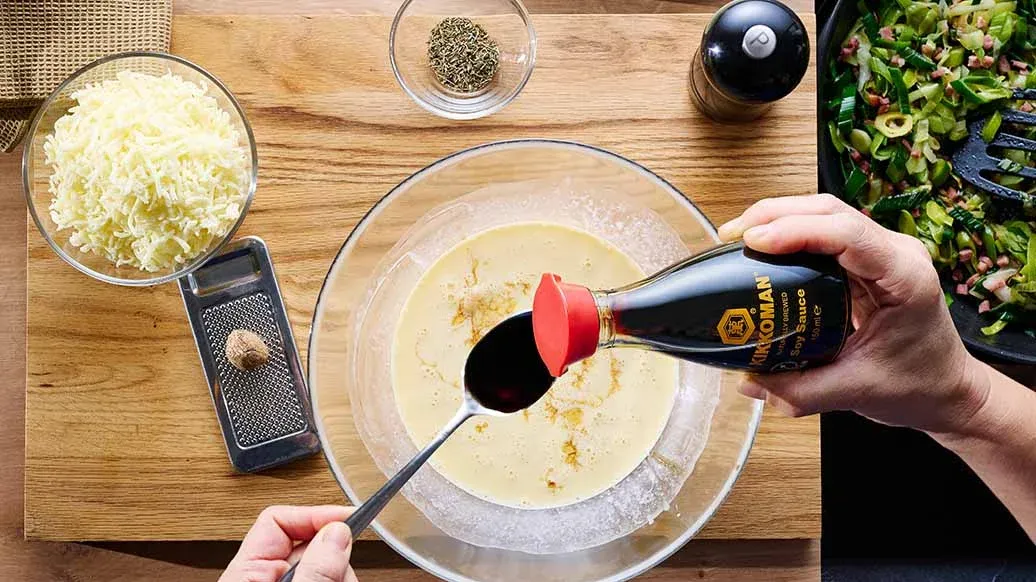 Una rivisitazione moderna di un classico francese: porri, pancetta affumicata e timo si fondono con uova, panna e Salsa di Soia Kikkoman in una quiche ricca e saporita, perfetta sia calda che fredda.