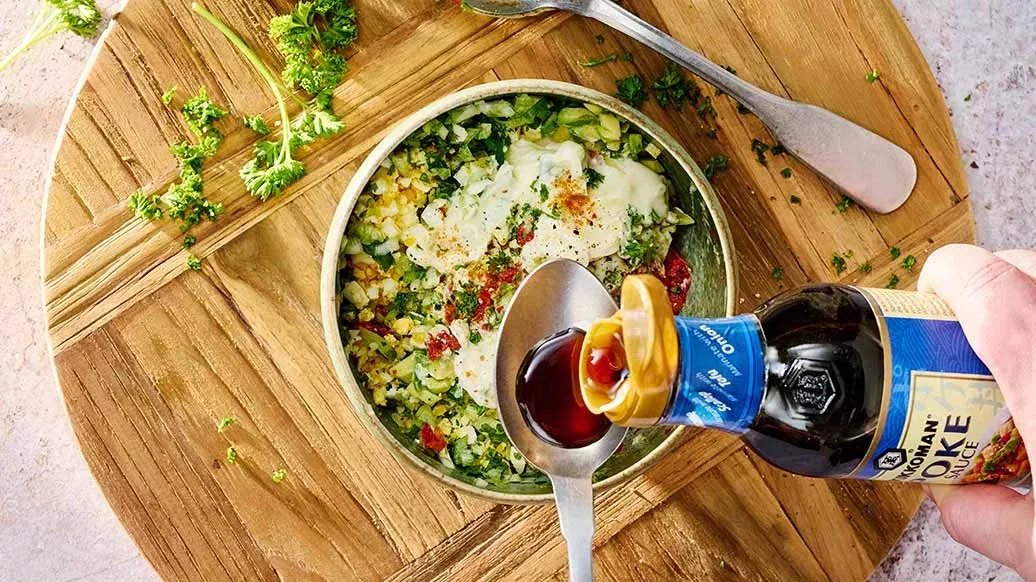 Mescolare gli ingredienti tritati con la salsa Poke Kikkoman, la maionese, l’aceto, il prezzemolo, il peperoncino in polvere e il pepe.