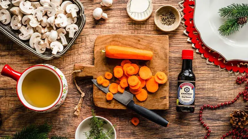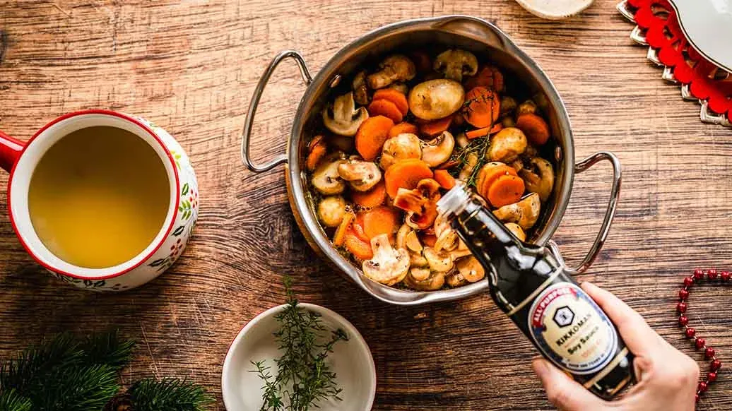 Per le tue feste, prova questo ricco e aromatico stufato di funghi e carote, cotto a fuoco lento nella birra scura con la Salsa di Soia Kikkoman. Aggiungi un tocco finale di panna per renderlo ancora più cremoso. Questo sostanzioso piatto vegetariano è perfetto da servire con patate arrosto.