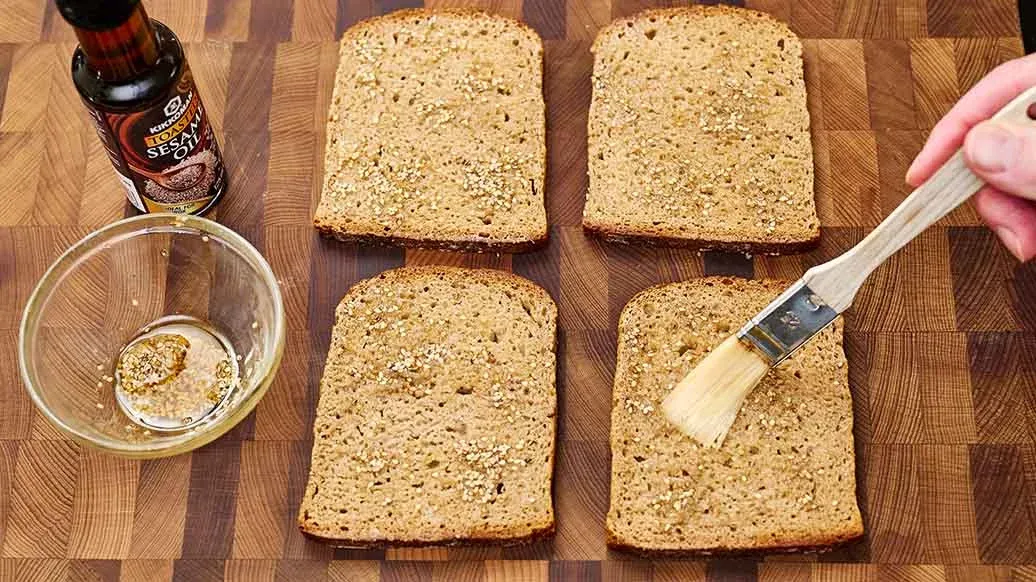 Pela e trita finemente l'aglio, poi mescolalo con 1 cucchiaio di Olio di Sesamo Tostato Kikkoman e con i semi di sesamo. Spalma un lato delle fette di pane con il composto e tostale in una padella capiente (o bistecchiera) con il lato oliato rivolto verso il basso, poi toglile dalla padella.