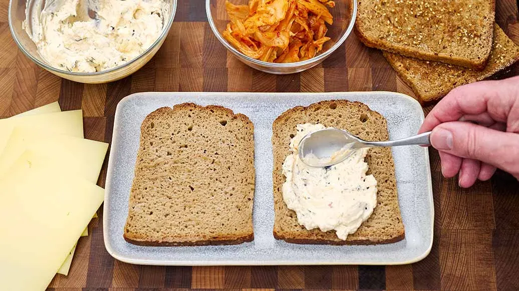 Spalma il composto di formaggio cremoso sul lato non tostato delle fette di pane, poi crea degli strati con il formaggio, il kimchi, i funghi e con un'altra fetta di formaggio. Copri con le restanti fette di pane.