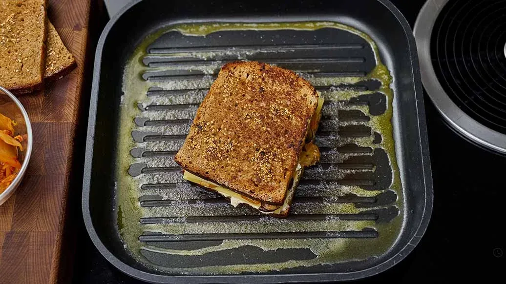 Formaggio a volontà! In questo sandwich tostato sulla griglia, il pane casereccio croccante al sesamo e aglio incontra il kimchi piccante e il formaggio fuso: un panino che conquisterà di sicuro ogni amante della cucina street food.