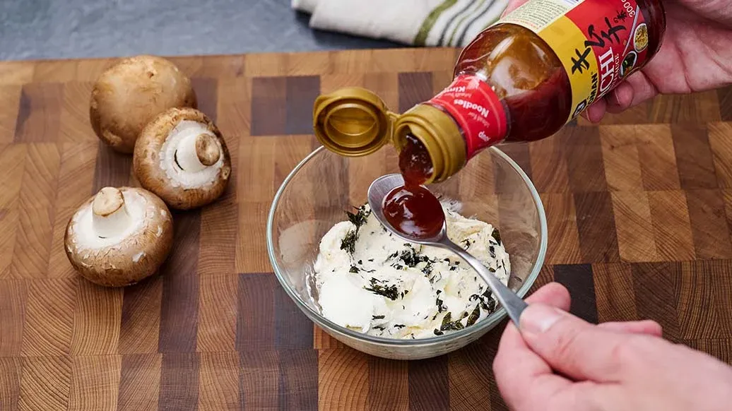 Trita finemente l'alga nori e mescolala con il formaggio spalmabile e il Salsa Kimchi Piccante Kikkoman.
