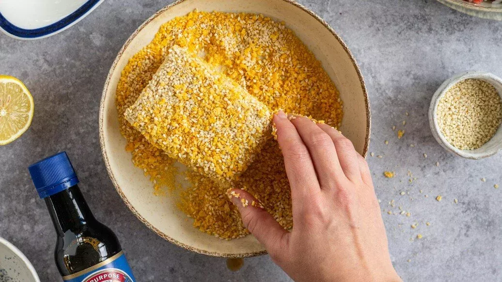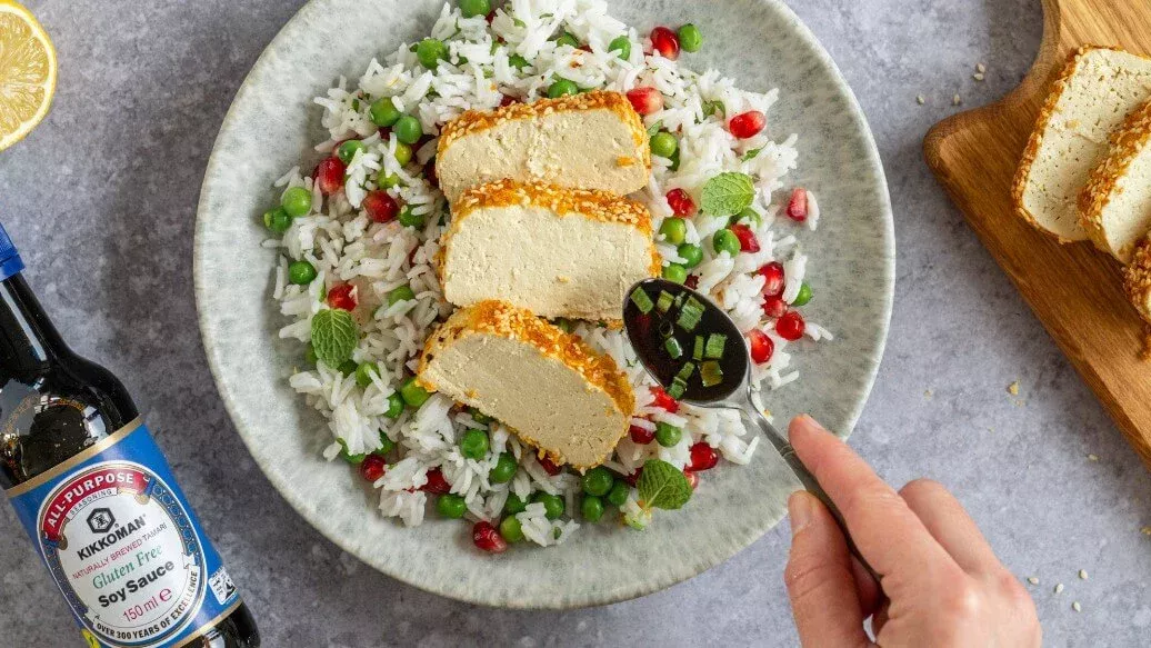 Immergere il tofu in una miscela di Salsa di Soia Kikkoman, latte di mandorla e fecola di patate. Quindi cospargere con i semi di sesamo e i cereali macinati. Friggere in olio d'oliva fino a doratura.