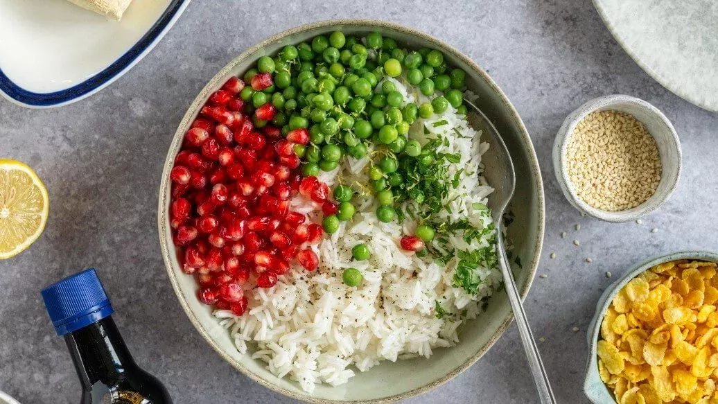 Sciacquare il riso, aggiungere il doppio del suo peso di acqua e cuocere per 10 minuti. Cuocere i piselli finché sono teneri e mescolarli con il riso, la menta tritata, la scorza di limone, il succo di limone, il pepe e i semi di melograno.