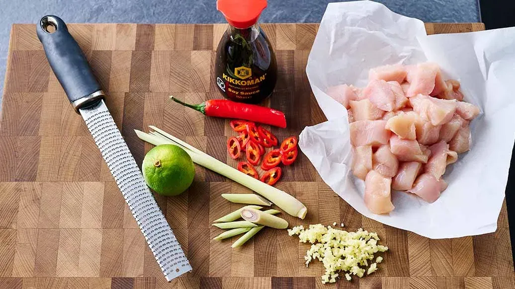 Tagliare il lemongrass a pezzi. Pelare e grattugiare/tritare finemente lo zenzero. Grattugiare la scorza del lime e spremerne il succo. Tagliare il peperoncino ad anelli. Tagliare il pollo a dadini piccoli.