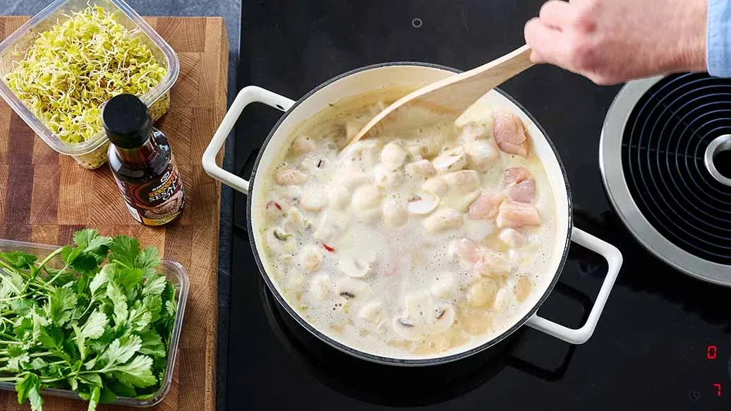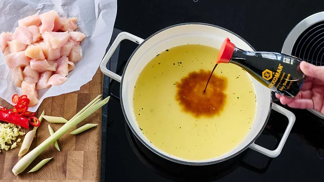 Portare il brodo di pollo a ebollizione con la Salsa di Soia Kikkoman. Aggiungere il lemongrass, lo zenzero, un po' di scorza e di succo di lime, il peperoncino, il latte di cocco e lo zucchero. Quindi scaldare.