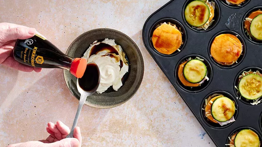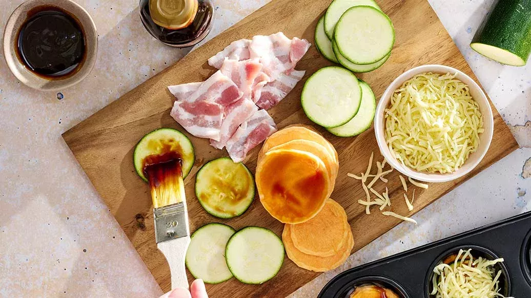 Preriscaldare il forno a 180 ºC e ungere una teglia da muffin con l’olio. Sbucciare le patate dolci e tagliarle in fette sottili insieme alle zucchine. Ricoprire con Salsa Teriyaki BBQ Kikkoman con miele. Tagliare la pancetta a pezzi. Adagiare le patate dolci, le zucchine, la pancetta e il Gouda alternativamente negli stampi per muffin e cuocere per circa 25 minuti.