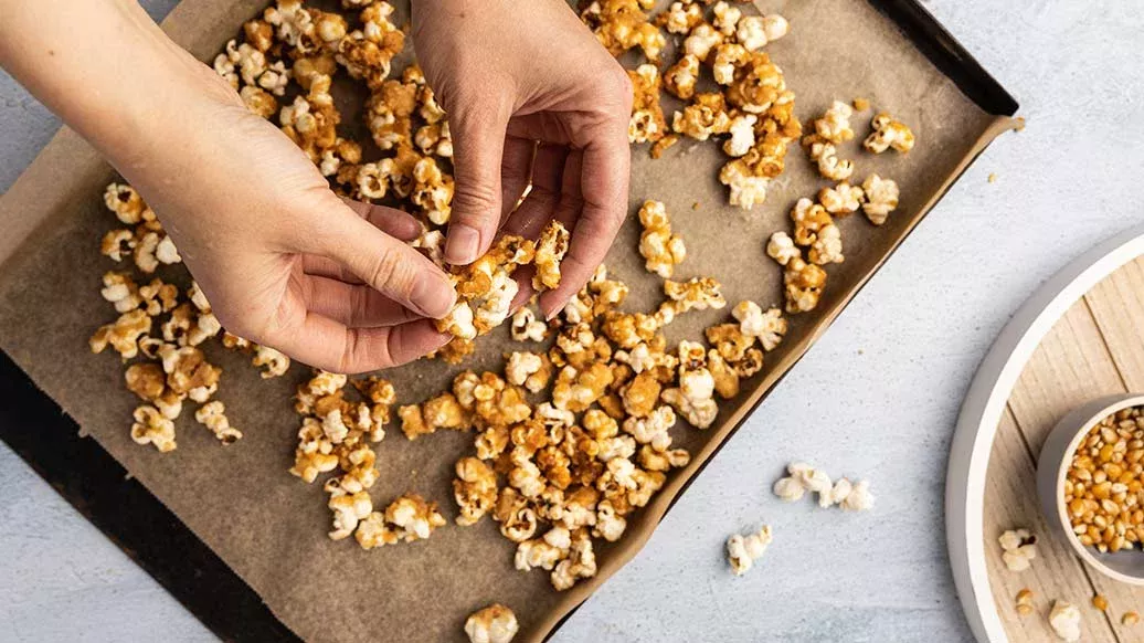 Stendere i popcorn al caramello su una grande teglia foderata con carta oleata. Aspettare che si induriscano, poi sbriciolarli e rimetterli nella ciotola.