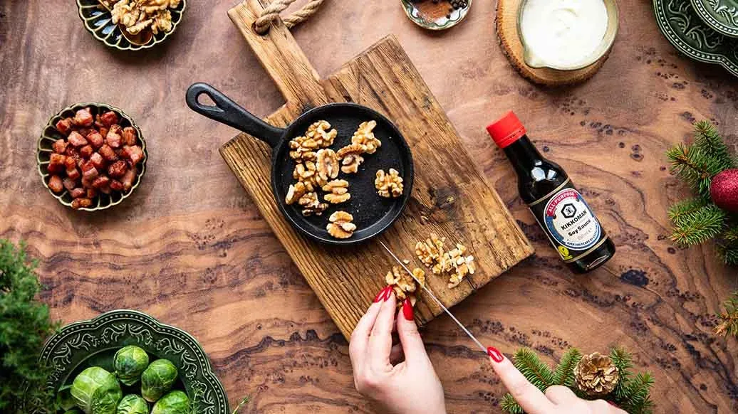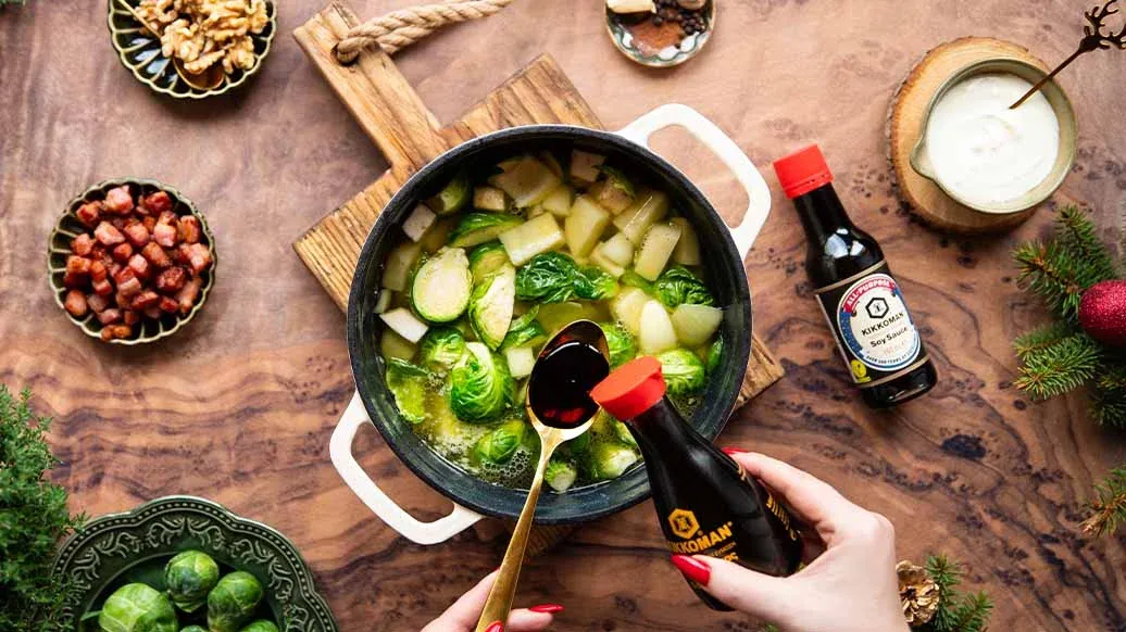 Una vellutata avvolgente e cremosa di cavoletti di Bruxelles e patate, arricchita con pancetta affumicata e un tocco di Salsa di Soia Kikkoman per una maggiore profondità di sapore. Completala con noci croccanti e un cucchiaio di crème fraîche per un antipasto festivo ed elegante.