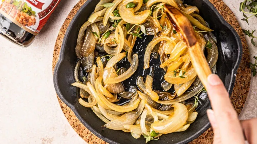 Tagliare la cipolla a striscioline, friggere in olio d'oliva per qualche minuto, poi aggiungere la salsa di soia Kikkoman. Una volta che la cipolla sarà diventata morbida, aggiungere la Teriyaki Marinata Kikkoman e le foglie di timo. Friggere ancora per qualche minuto il tutto.