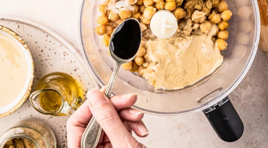 Lasciare in ammollo i ceci per tutta la notte con ½ cucchiaino di bicarbonato di sodio. Sciacquare, coprire con acqua fresca e aggiungere un altro ½ cucchiaino di bicarbonato di sodio. Cuocere per circa 2 ore fino a quando i ceci non saranno morbidi. Mentre i ceci scolati sono ancora caldi, mescolarli con la tahini, il succo di limone, l’aglio, la salsa di soia Kikkoman e il cumino. Frullare il composto in un frullatore fino a ottenere una consistenza liscia e vellutata e aggiungere gradualmente l'olio d'oliva.