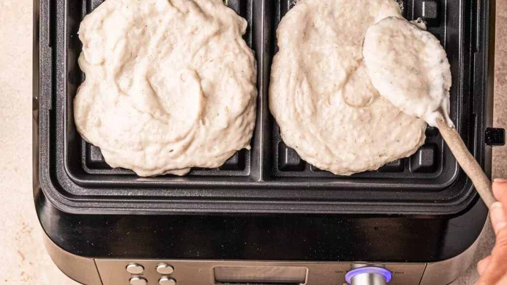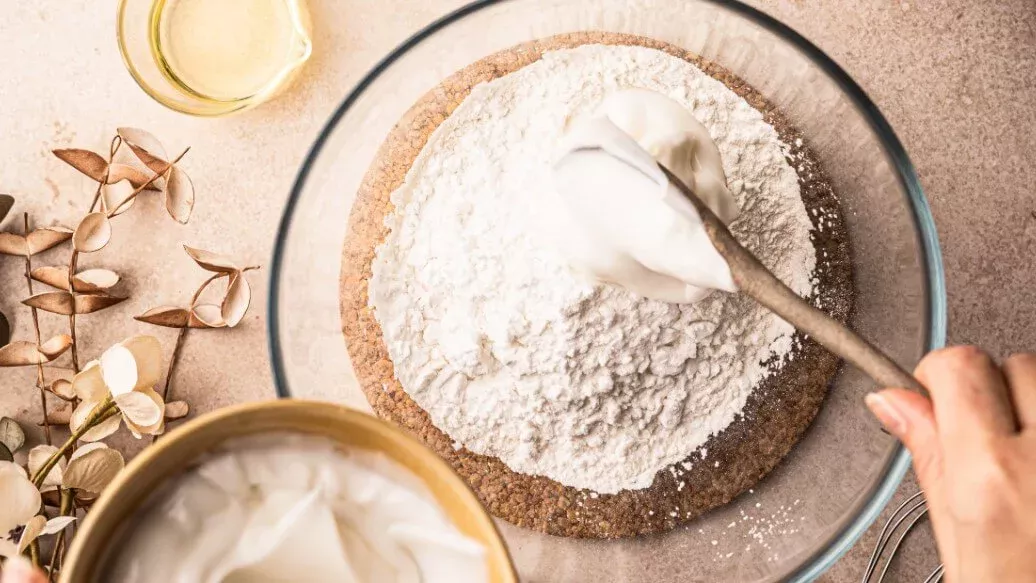 Scaldare lo yogurt vegano a temperatura ambiente. Aggiungere il latte vegetale e l'olio e mescolare. Aggiungere la farina di riso, la fecola di patate, le bucce di psillio, il bicarbonato di sodio e la salsa di soia Kikkoman. Frullare il tutto accuratamente.