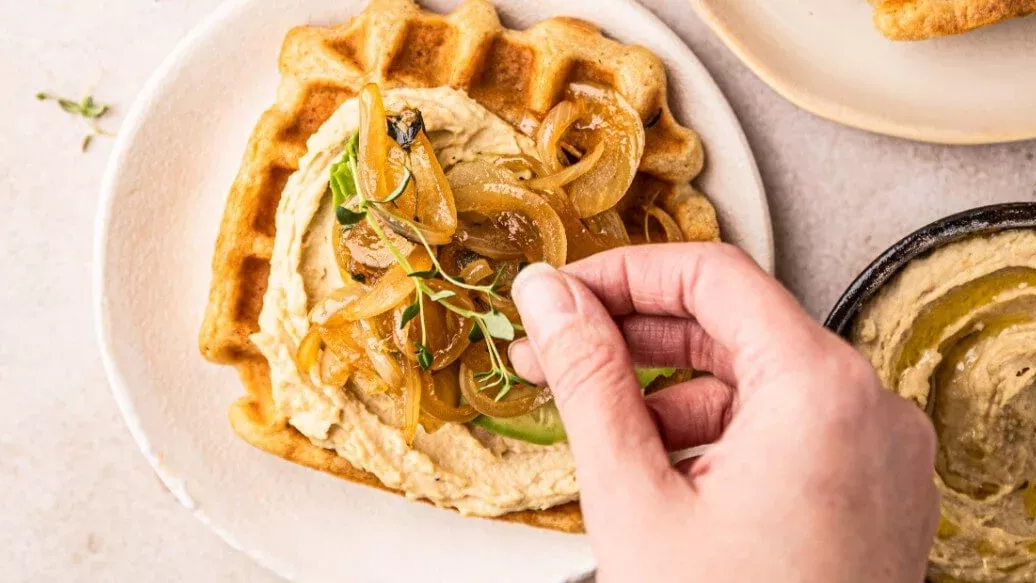 Spalmare i waffle con l'hummus, poi aggiungere l'avocado affettato e la cipolla teriyaki. Guarnire con timo fresco e servire.
