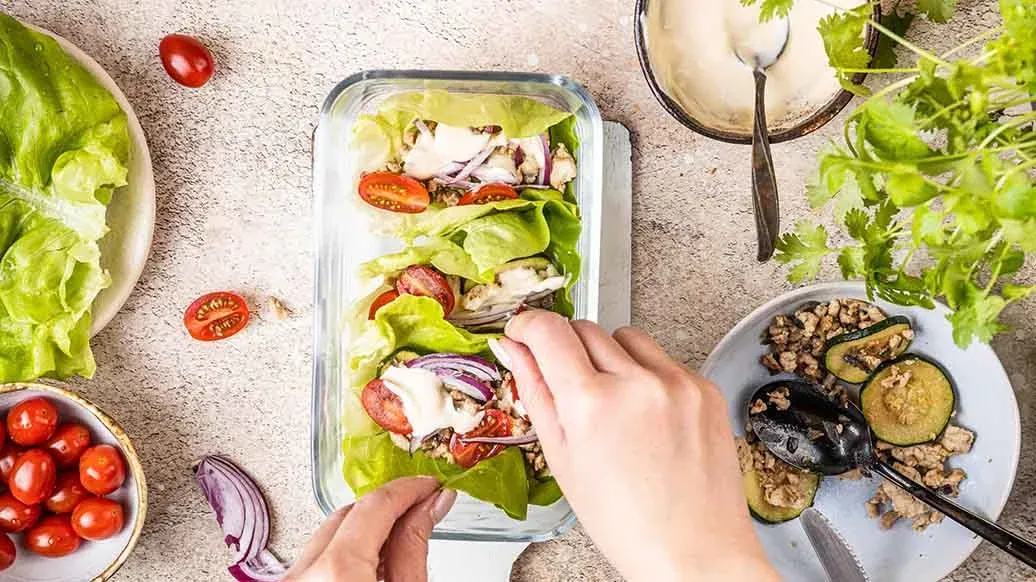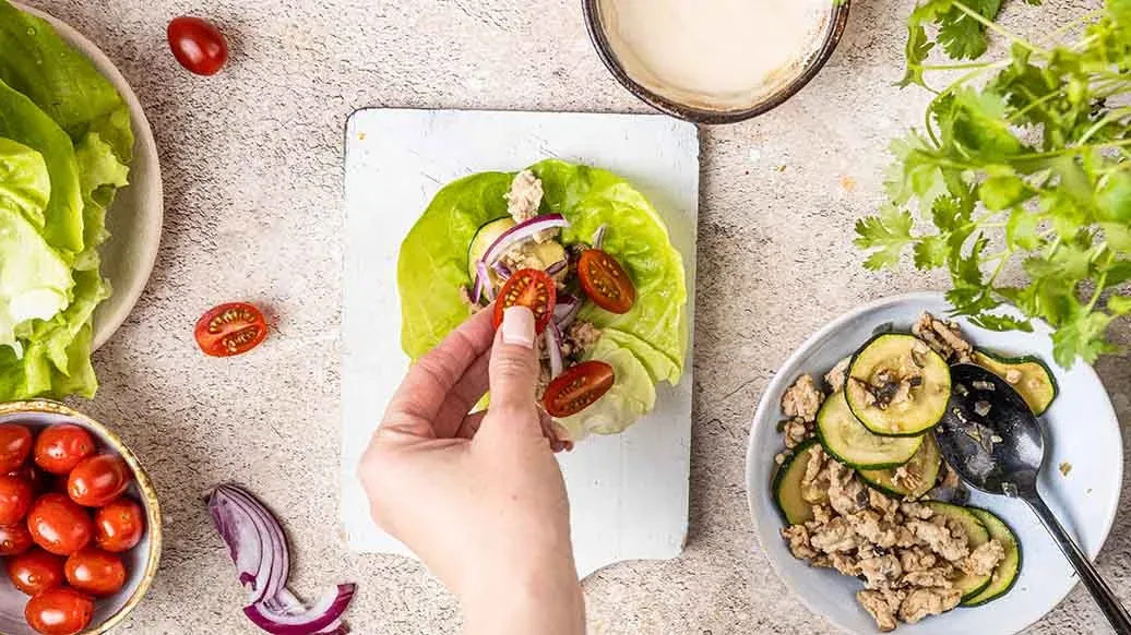 Leggeri wrap di lattuga con un delizioso ripieno di tacchino e zucchine. Serviti con una semplice salsa di yogurt e Salsa di Soia Kikkoman che aggiunge profondità senza bisogno di altro sale: una rivisitazione fresca del classico wrap.