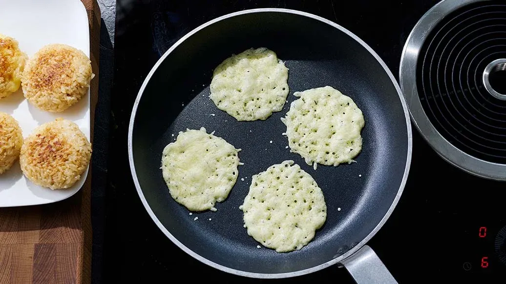 Scaldare un'altra padella a fuoco basso. Stendere il formaggio per pizza in quattro piccoli cerchi nella padella. Quando è fuso e leggermente dorato, rimuovere e posizionare due cerchi su ciascuna pallina di riso al formaggio.