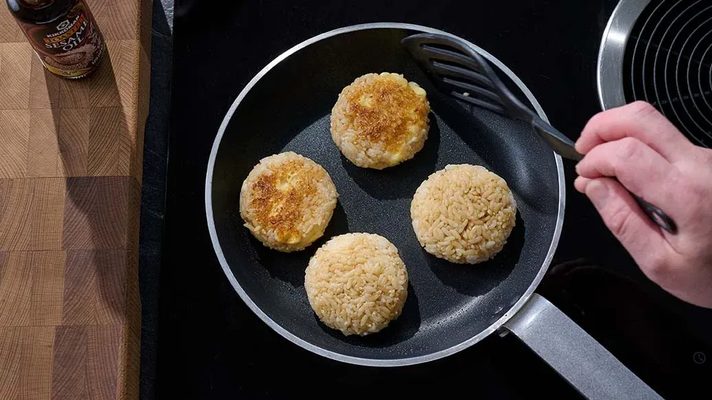 Friggere su entrambi i lati le palline di riso nell'Olio di Sesamo Kikkoman. Spennellare con la salsa rimanente del passaggio 3 e friggere per 3-4 minuti fino a quando non saranno dorate e croccanti.