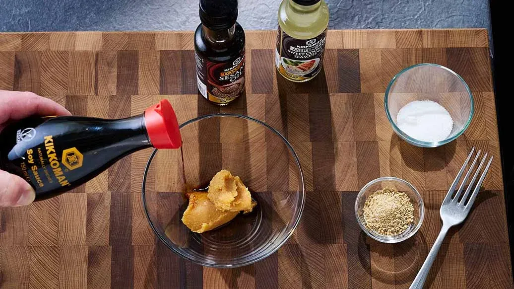 50 g di miso bianco – 1 cucchiaino Salsa di Soia a Fermentazione Naturale Kikkoman – 1 cucchiaio di zucchero – 1 cucchiaio Condimento Dolce da Cucina in Stile Mirin Kikkoman – 1 cucchiaino Olio di Sesamo Tostato Kikkoman – 1 cucchiaino di semi di sesamo macinati