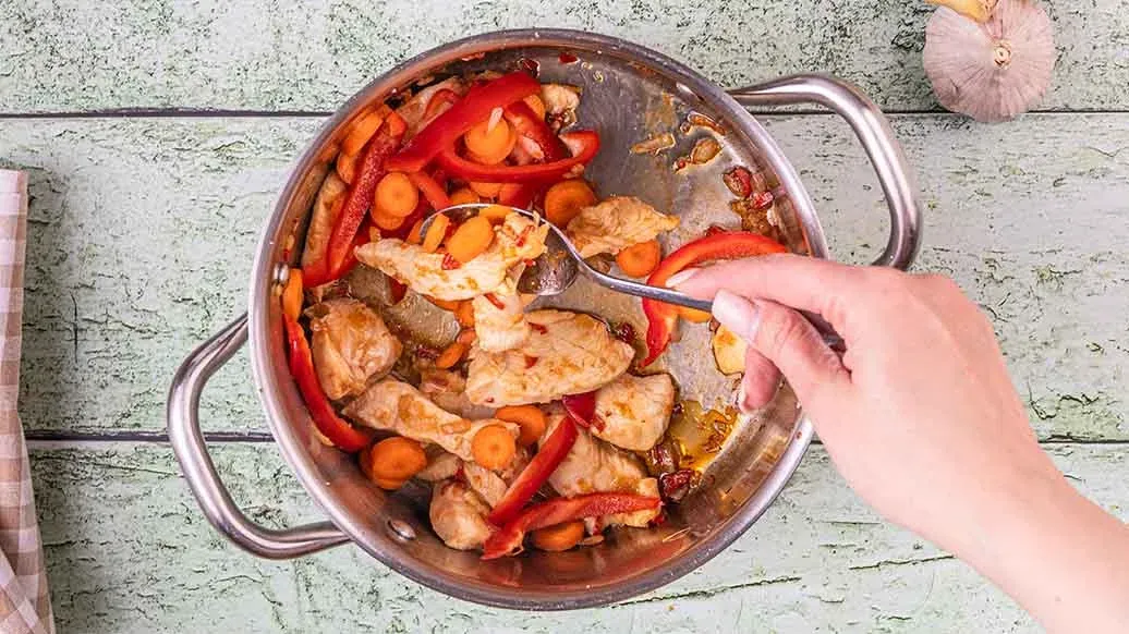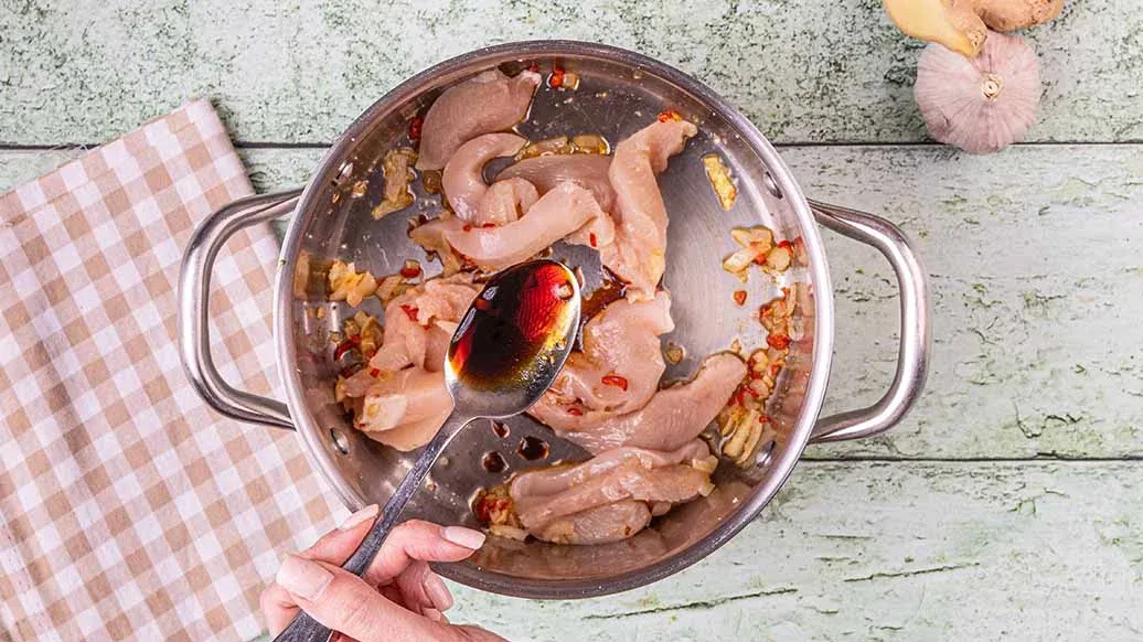 Trita la cipolla. Saltala in padella nell’olio vegetale con il peperoncino, l'aglio e lo zenzero. Aggiungi il petto di pollo a fette e la Salsa di Soia Kikkoman. Fai saltare per 2 minuti, mescolando costantemente.
