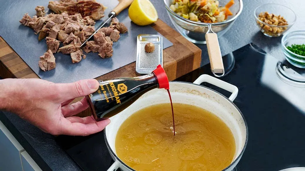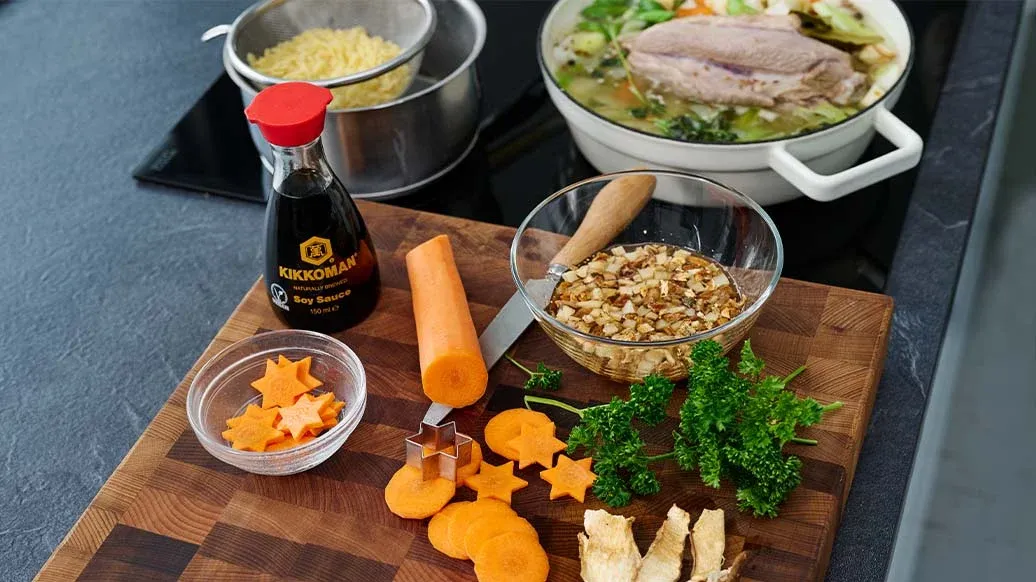 Un perfetto piatto delle feste: brodo di tacchino, carote, sedano rapa, porri, arricchito da Salsa di Soia Kikkoman e spezie profumate. Servito con pastina e funghi, questa zuppa confortante sarà il cuore caldo e avvolgente della tua tavola invernale.