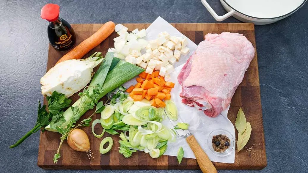 1 carota – 1 pezzo di sedano rapa – 1 cipolla piccola – 1 porro – 1 coscia di tacchino, di circa 1,2 kg – 2 foglie di alloro – 2 bacche di ginepro – ¼ di pepe nero in grani – 4 bacche di pepe della Giamaica (pimento) – ¼ cucchiaino di semi di cumino dei prati – 4 rametti di maggiorana – 3 cucchiai Salsa di Soia a Fermentazione Naturale Kikkoman