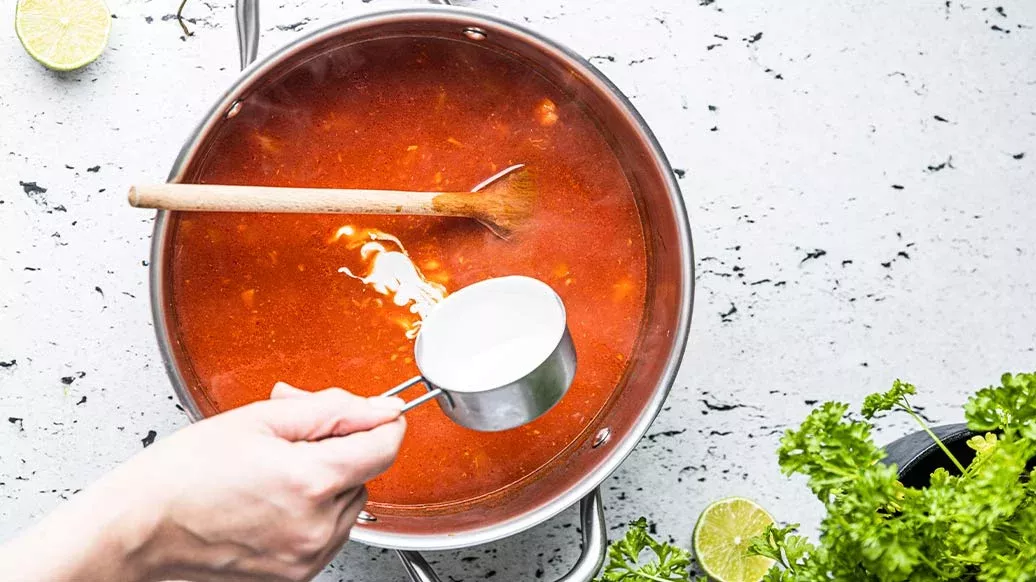 Scalda il brodo vegetale fino a quando non sarà caldo. Versa nella passata di pomodoro la Salsa di Soia Kikkoman e riscalda il brodo. Cuocere a fuoco lento per 10 minuti.
