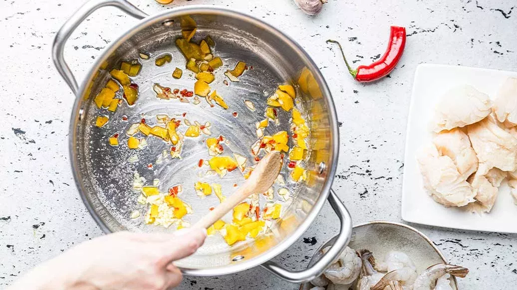 Sbuccia e trita l'aglio. Taglia il peperone e il peperoncino a cubetti piccoli. Sciogli il burro in una padella a fuoco medio. Aggiungi le verdure nella padella e friggi per 1 minuto.