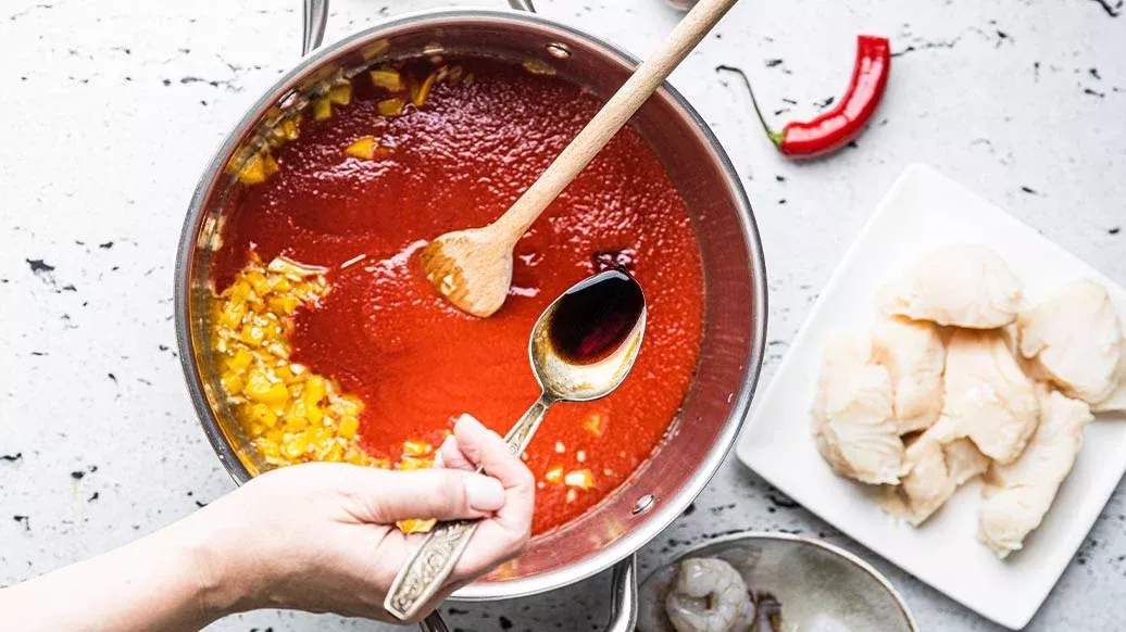 Una deliziosa, ricca e cremosa zuppa di pomodoro ricca di tenero merluzzo e gamberetti succosi per un pasto caldo e avvolgente pieno di sapori vibranti.