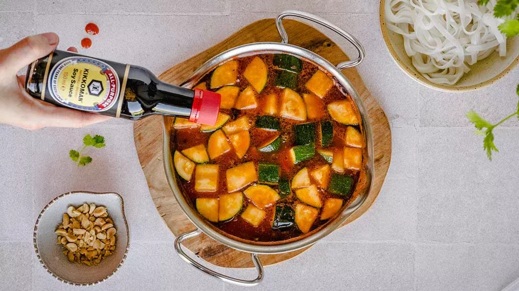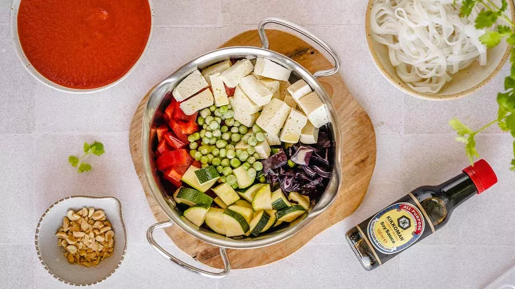 Scalda l'atmosfera con una ciotola di questa zuppa fumante ricca di sapori e colori vivaci. Questo brodo salutare combina verdure nutrienti con tofu ricco di proteine. Accompagnato da un contorno di noodles, è un pasto perfettamente equilibrato, leggero e nutriente.