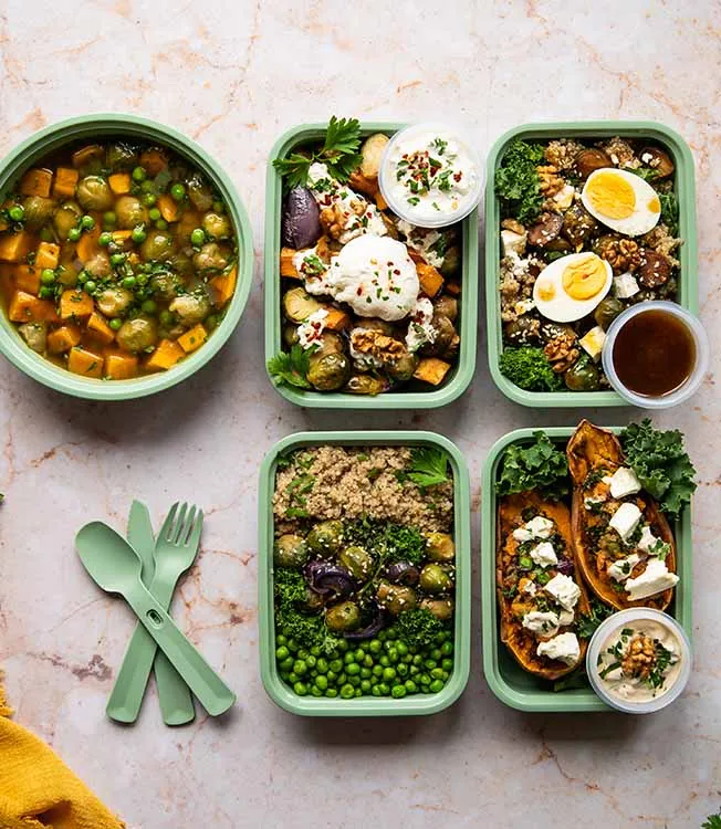 Lessa le uova per 7 minuti finché non saranno sode. Rimuovi i gambi duri dal cavolo riccio e taglialo a pezzetti. Trasferisci la quinoa nei contenitori portapranzo, poi aggiungi i cavoletti di Bruxelles, il cavolo riccio, le uova tagliate a metà e la feta.