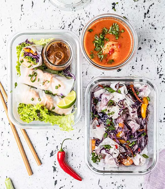 Involtini estivi con verdure, gamberetti e salsa di arachidi