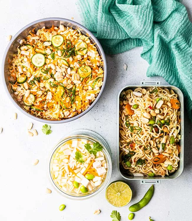 Trita finemente il pak choi, taglia la carota a bastoncini sottili e il tofu a cubetti. Metti le verdure tritate e il tofu nei barattoli. Aggiungi l'edamame e i noodles.